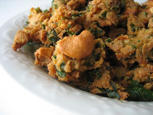 Spinach with broken cashews combined with spiced up flour blend to make this crispy snack. Pakoda mostly termed as “Pakora” in North Indian Sweet stalls are very rich with loads of ghee and nuts and usually seen with the combination of any leafy or mixed vegetables. This recipe of mine is for one such variety, petty much similar to regular pakoda with few additions.
