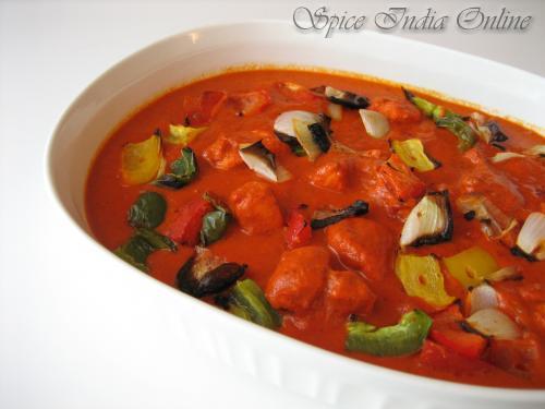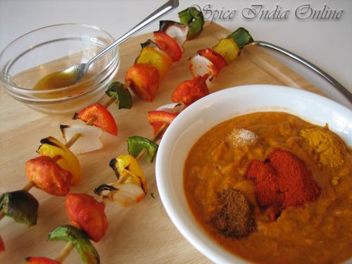 Grilling : Grilled veggies are not a part of traditional tikka masala but adds great colour and helps for yielding a considerable quantity if feeding a large crowd. Cut the veggies listed under table-2, mix with salt and oil.  Soak the bamboo skewers in water for 1/2 hour so that it may not break easily while broiling. Place the oven grill under the broiler, probably the second rack from top. Turn the setting to broil so that the upper coil lights up. Thread the marinated chicken and veggies as shown onto the bamboo skewers and place them in baking tray and broil for 10 to 12 minutes, turning twice or thrice to cook evenly, brush with little melted butter and cook until small dark black spots appear on th veggies and chicken. When done remove and set aside. Caution: If broiling, please make sure you check it every few minutes to avoid burning, because this could happen soon depending on your baking sheet.