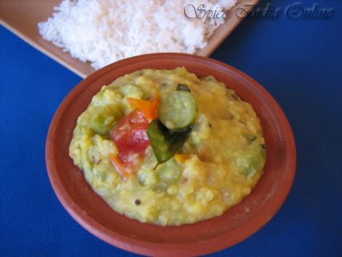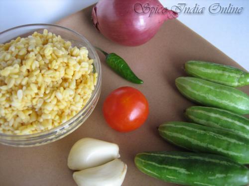 Soak split green gram for 15 minutes, wash and drain. Wash the Kovakkai, trim the edges and cut them into small pieces and pressure cook with split green gram, onions, garlic, green chili, chopped tomatoes and turmeric adding about a cup of water. This steams up quickly, so just give one hiss and switch off. Now heat oil or ghee in pan and splutter mustard, cumin seeds, dry red chili, curry leaves and sprinkle asafoetida. Add the cooked lentil vegetable gravy, salt and fresh grated coconut. Simmer for few minutes or until it thickens and then serve. Good with rice topped with ghee or as a side for Kara Kuzhambu.