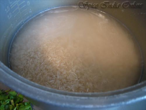 Soak basmati rice for 10 minutes, wash and drain completely. Soaking time varies with the quality and brand of rice, if pressure cooking , soaking time should be very less. For rice cooker allow 15 to 20 minutes. Use the variety which you are most comfortable with.