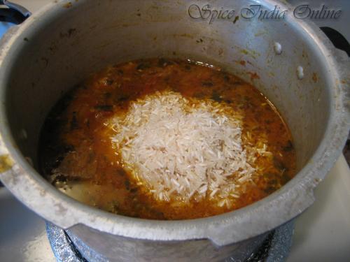 Add rice to the gravy, close with the lid and cook upto 2 whistles and switch off. Immediately shift the cooker from the hot burner to a different place, this reduces too much browning on the bottom of the pan. Let the steam release completely. Allow 15 minutes and then open.