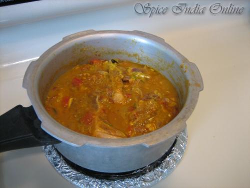 Pressure cook this gravy for upto 3 whistles and switch off. Once the steam settles, the gravy will look like a thin stew shown below.