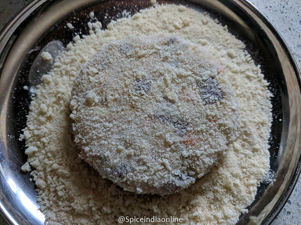 Now in the bread crumb mixture.