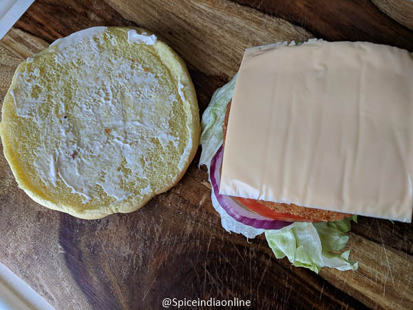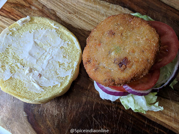Now assembly line… apply mayo on the buns, layer with lettuce, sliced onion, tomato, cucumbers.. and place the patty. You may use any hot sauce or ketchup or red chilli sauce if you like it spicy.