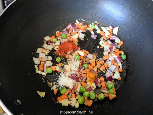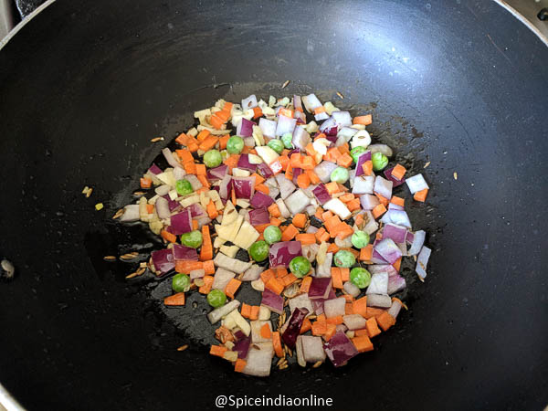 Heat oil in a kadai, add in cumin seeds and saute the chopped onion, carrots, green peas, ginger & garlic with the pinch of sugar. Light saute is enough!