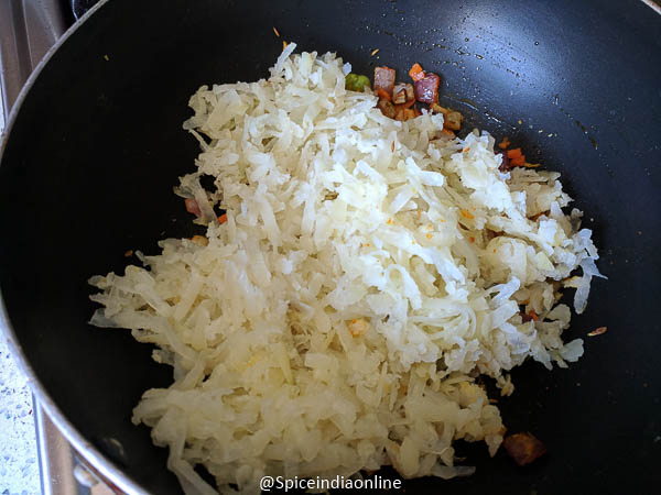 Add the boiled potatoes… you may either mash or use a grater which gives a uniform look to the patty. Saute well until everything blends well. The mixture should not be watery… keep sauteing until it turns into slightly dry mixture. Switch off.