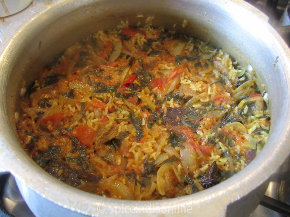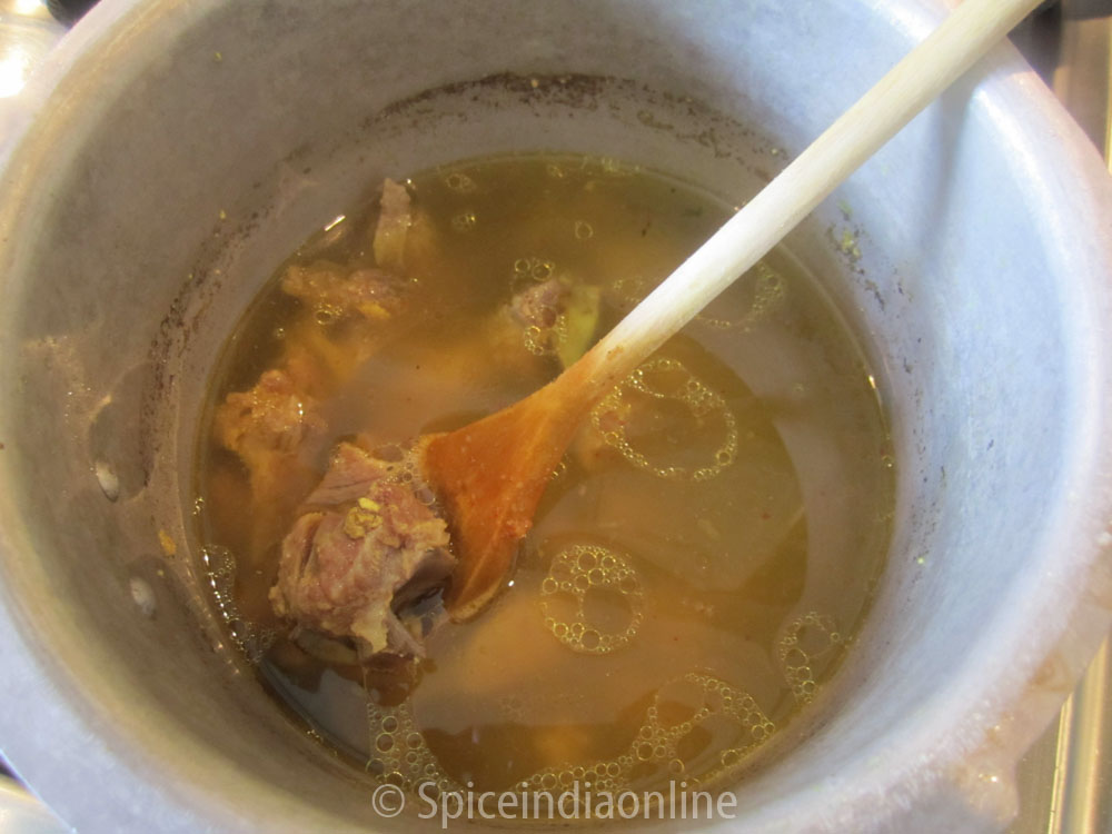 Now comes the first part of pressure cooking the mutton – Mutton / Goat needs to be marinated in 1/2 cup yogurt, turmeric powder and kosher salt.  Transfer the marinated meat along with  3 & 1/2 cups of water. (For 2 cups of raw rice we need about 4 cups of liquid which is 1/2 cup yogurt + 3&1/2 cups of water) This measure will work out best to cook the rice perfectly. Pressure cook the meat for upto 3 whistles or 15 minutes over low medium flame. Tender baby goat should cook within 3 whistles. Once done, let the pressure settle and keep this aside.