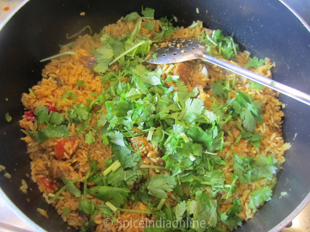 Let it come to first boil, add the soaked rice and squeeze the lemon and pour the juice over it. Pressure cook for 1 whistle or 5 minutes over medium high flame. Once done bring down the flame to low setting. Let it cook for 15 minutes over this setting. After that, switch off and let the pressure settle completely. Carefully open the cooker and spread the biryani in a wide tray or bowl and cool it. Garnish with more chopped coriander leaves. Mix gently and serve hot!