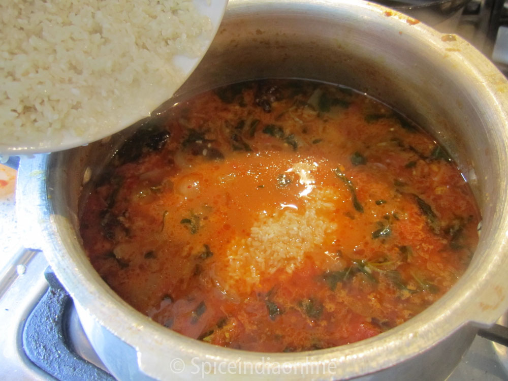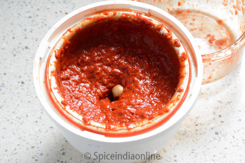 To start with we need Seeraga Samba rice – this needs to be soaked for 15 minutes before cooking.  Then comes the Red Chili paste which gives nice heat and color to the recipe. For red chili paste recipe (we soak dry red chilies in hot water and then grind to a fine paste) click on name to get the recipe RED CHILI PASTE