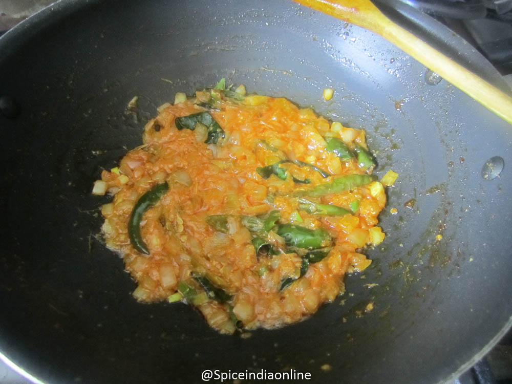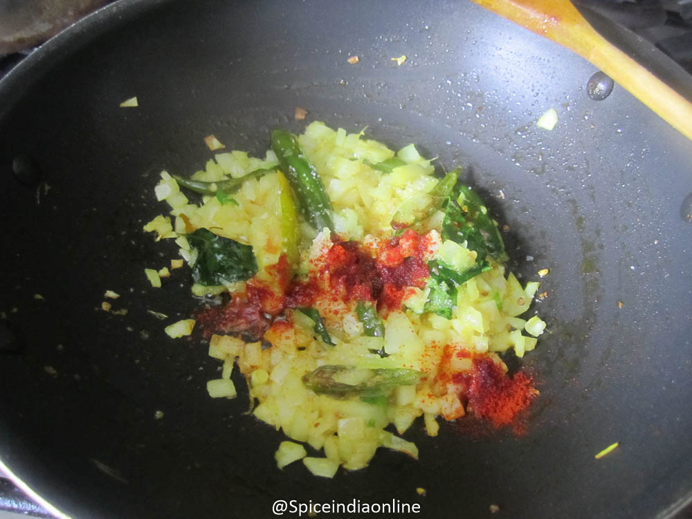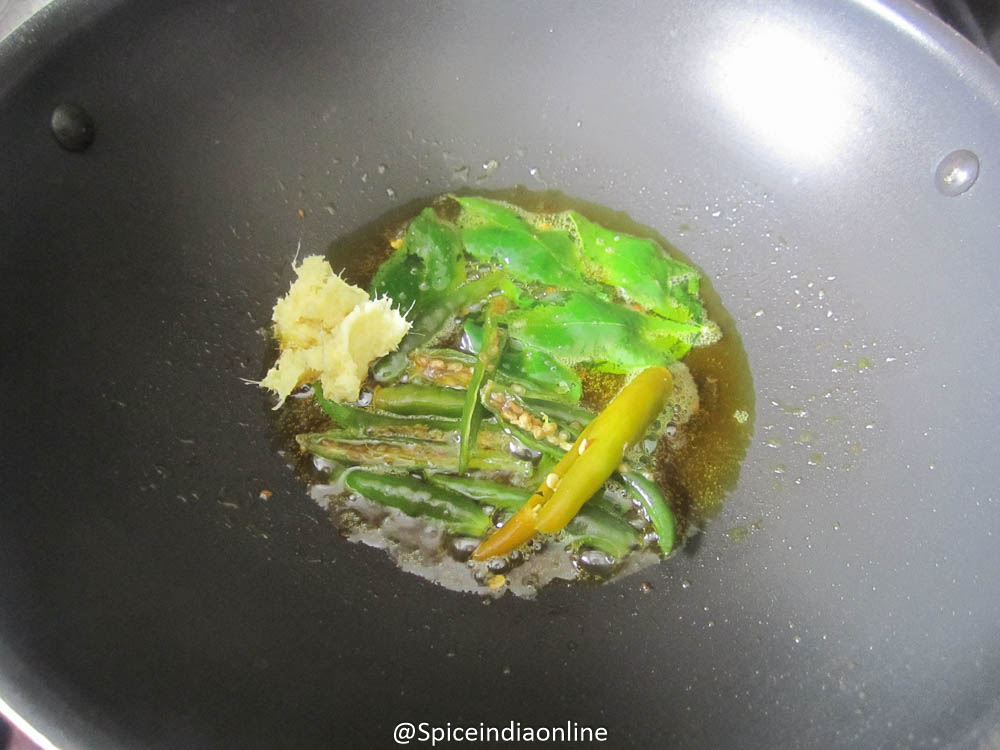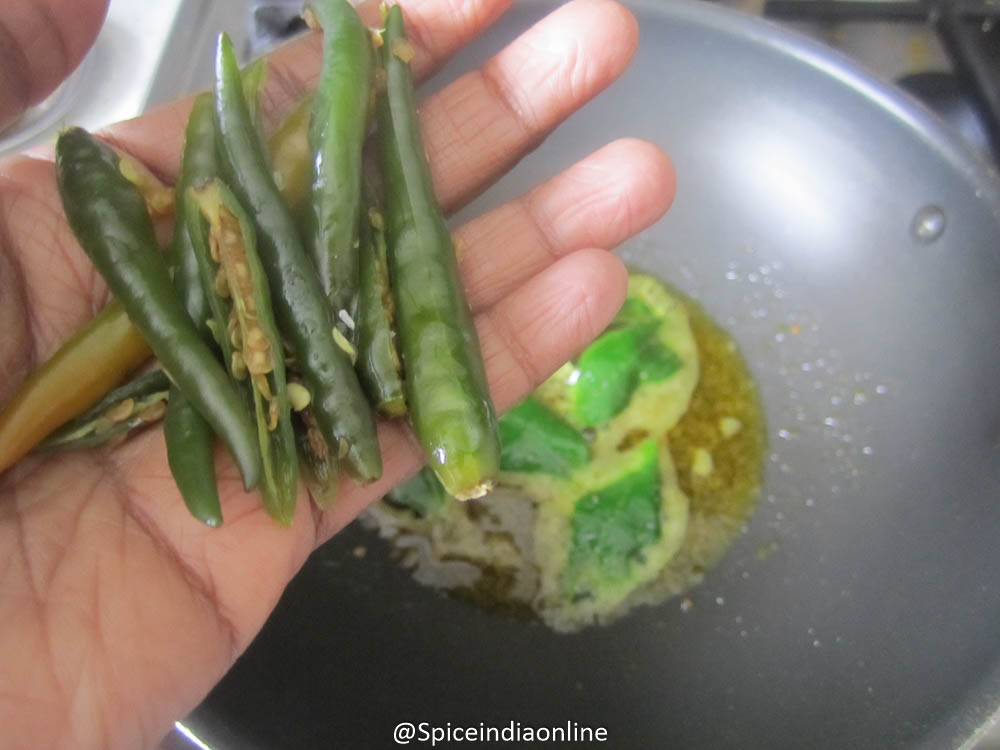 Add in slit open green chilies and fry them too.