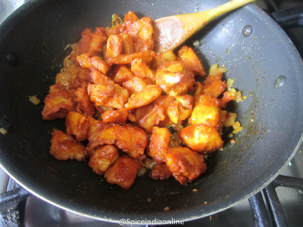 Give a quick stir fry and switch off. Now your hyderabd style apollo fish fry is all ready to dig in!