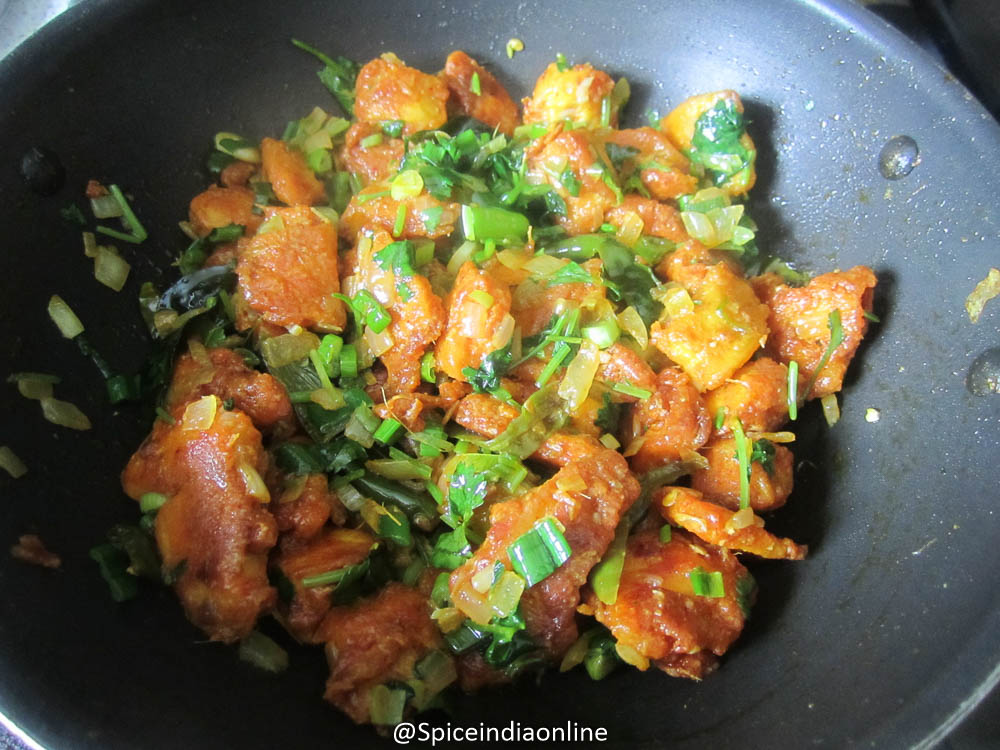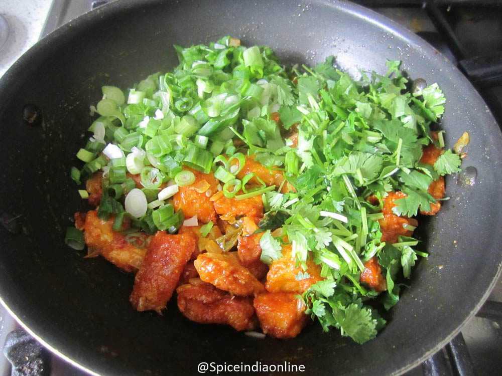 Add in equal portions of chopped coriander leaves and spring onions.