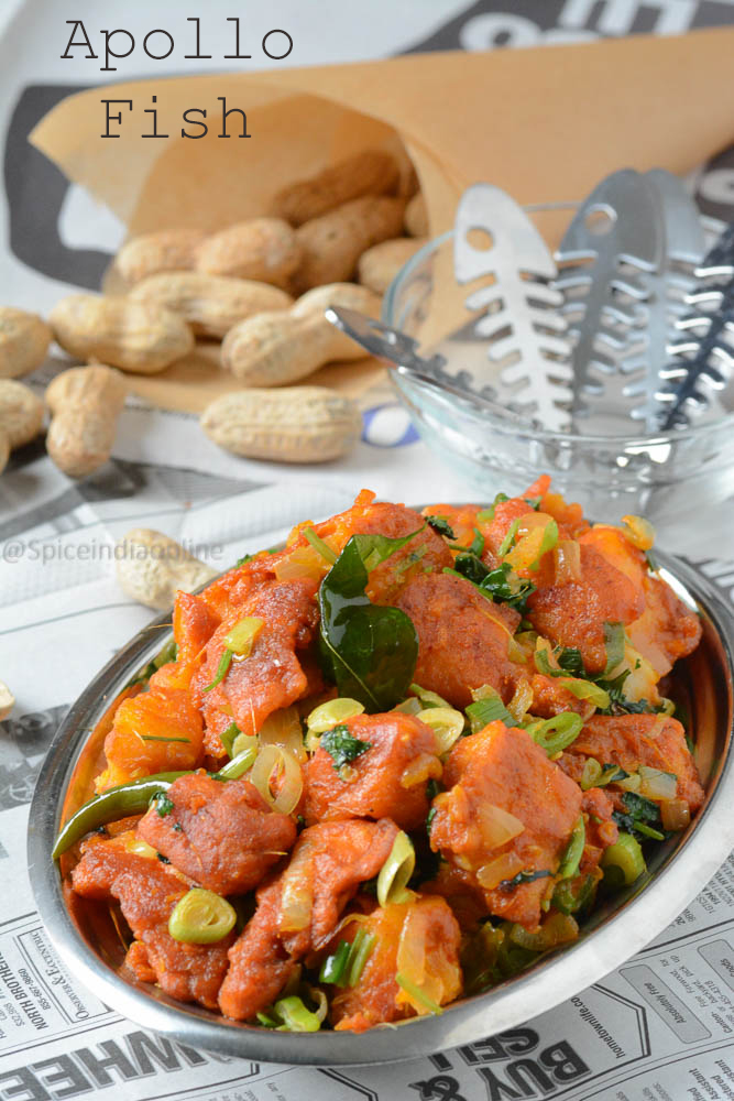Apollo Fish Fry is a bar style fish fry recipe that is very popular in Hyderabad, often served as an appetizer in most restaurants, more likely under bar food menu. Its kind of a fusion dish which has all the effect of a chicken 65 with little bit of Indo chinese and Andhra style cooking. Bunch of spicy green chilies are added to make it super spicy and at the same time yogurt is added to the final dish to balance the heat and also to keep the fish moist with the masala. I have no clue from where or why its called as apollo fish, I tasted this in an Indian restaurant which specializes in Andhra style cooking – it tasted awesome and here you go…my attempt in replicating it, which matched the restaurant style.