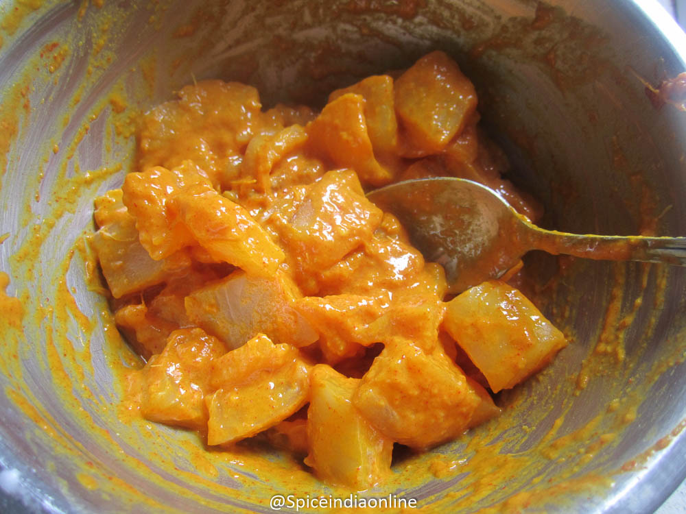 Mix everything to coat the fish with the masala. Let it rest for 1o minutes. Meanwhile heat oil in a pan.
