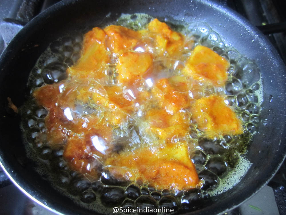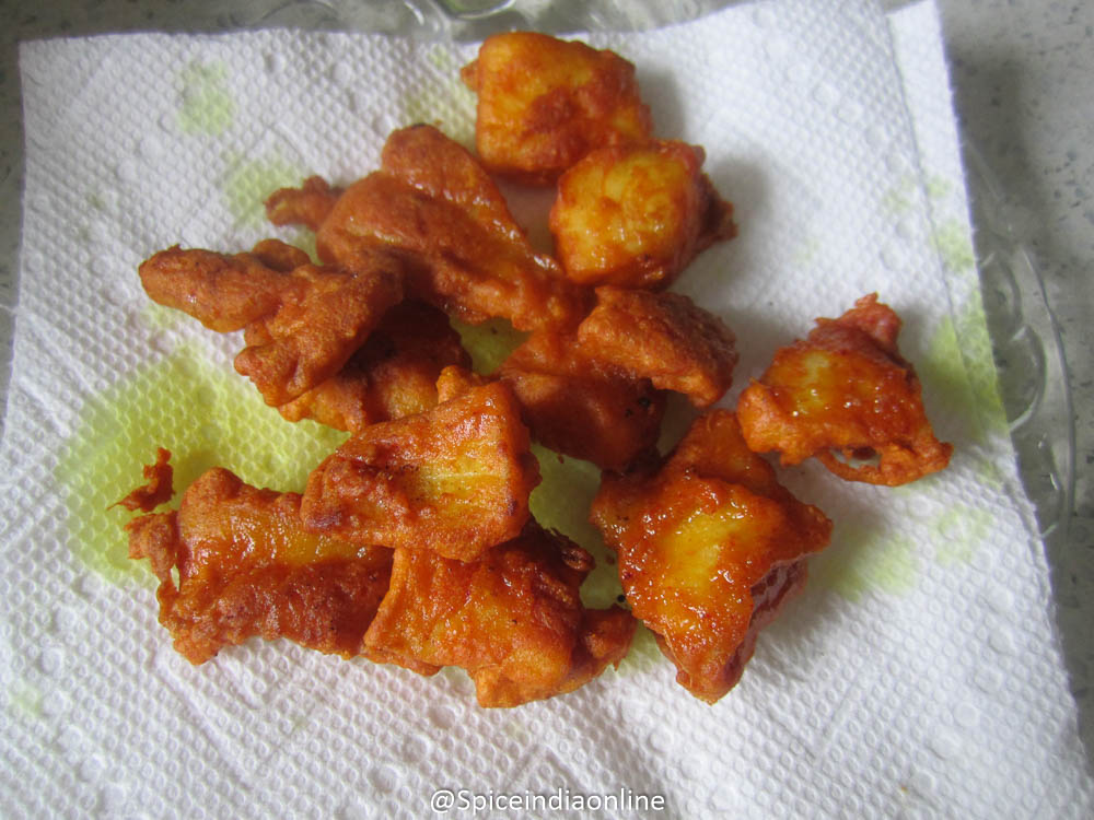 Deep fry them to golden, remove from pan and drain all excess oil by placing them over a paper towel. Repeat for rest of the pieces and keep them ready.