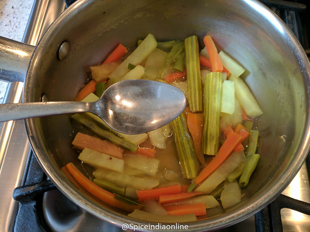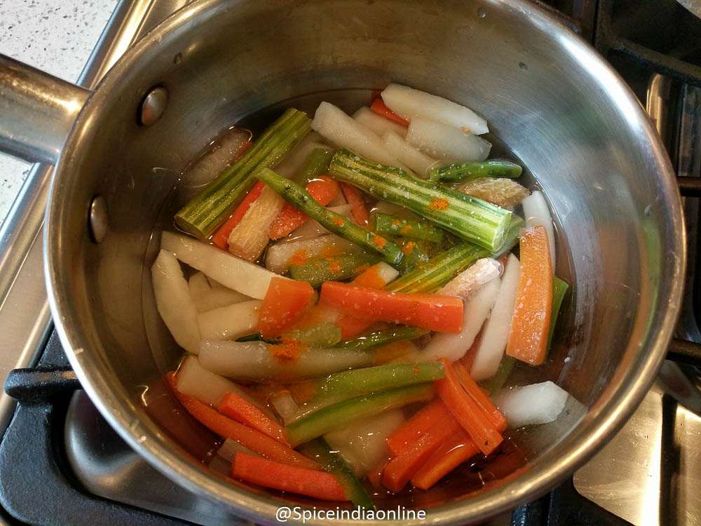 Cook all the veggie pieces till tender with 2 cups of water, a pinch of turmeric & salt. (Do not add all the salt it may not cook the veggies through, just a pinch will do!)