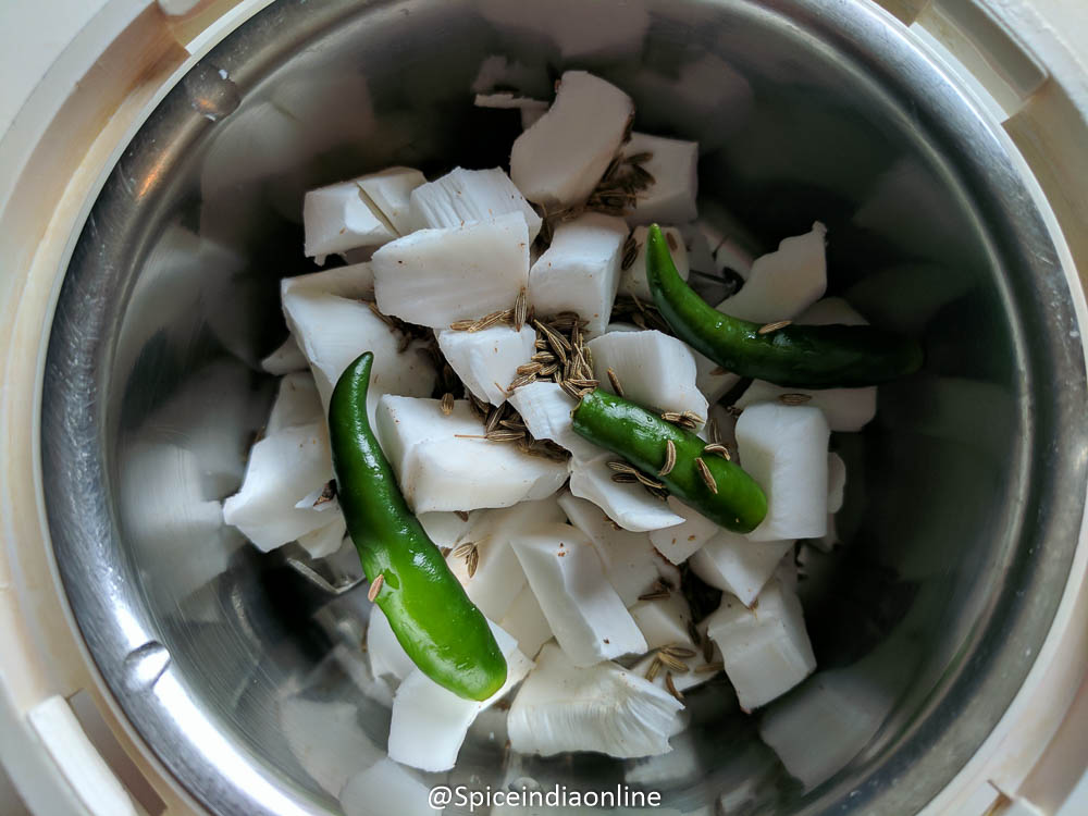 While that is cooking, grind coconut, green chili and cumin seeds to a paste. Keep this aside.