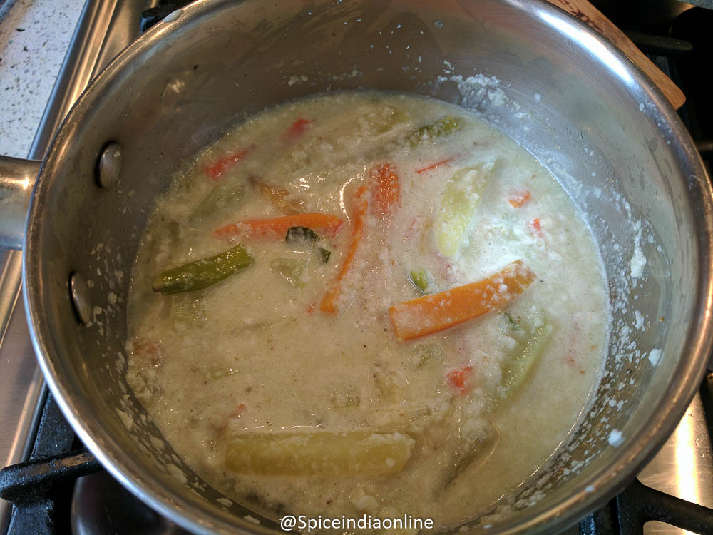 Now add the ground coconut paste to the cooked veggies. Add salt at this stage.