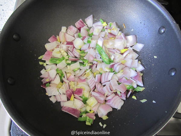 Now in a kadai heat little oil and fry onion, spring onion white only, green chili, minced ginger, garlic and sugar over high flame for few seconds.