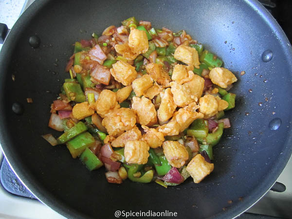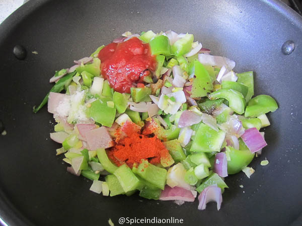 Followed by green capsicum, ketchup, red chili sauce, soy sauce, red chilli powder and salt. Fry over high flame for few seconds.