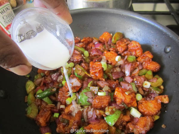 Add in the corn flour mixed with water to this mixture and saute again over high flame.