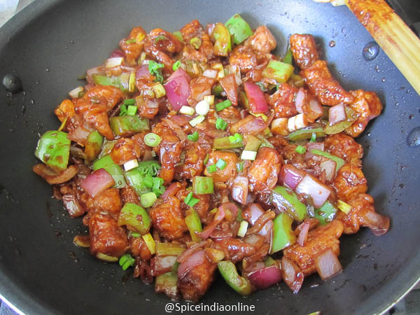 The mixture will thicken and get a shiny glow… switch off and garnish with green onions! Serve it as a starter or as a side for fried rice.