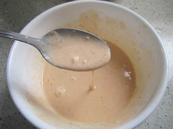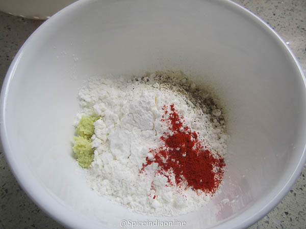 Now for the batter… mix maida, corn flour, salt, ginger garlic paste and chili powder with some water.