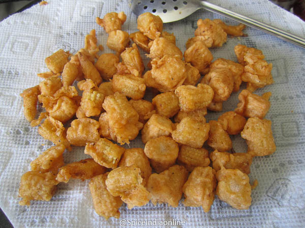 Fry them till golden brown and remove and reserve. (I did not add nay food color hence it looks pale)