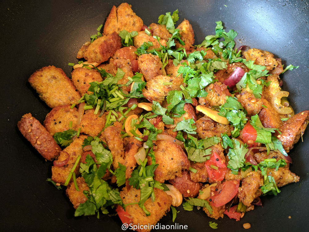 Upma in general is a simple, yet comforting dish. It is quite versatile and can be fixed in less than 15 minutes. Today we are making bread upma, which is one such fancy way to use leftover bread or just a way to enjoy something different with regular bread other any making a sandwich. Plain bread sauteed with fresh onion, chilies, ginger and tomatoes along with tempered spices! Usually this is served as breakfast but can also be a light eve snack…. perfect for kids lunch box too! This recipe is adapted from Vahrehvah youtube videos.