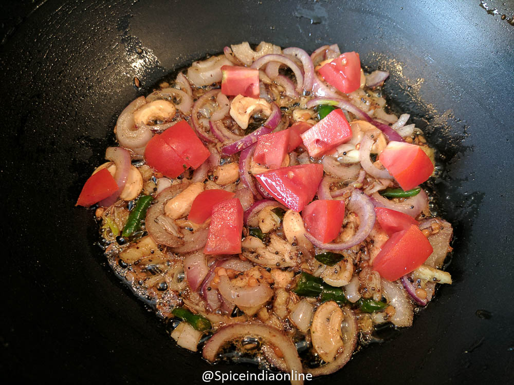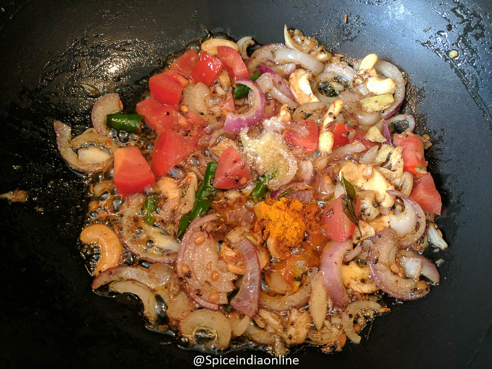 Followed by sliced onions, chopped green chili and ginger. Fry them till translucent. Then add in chopped tomatoes and cook them till soft.