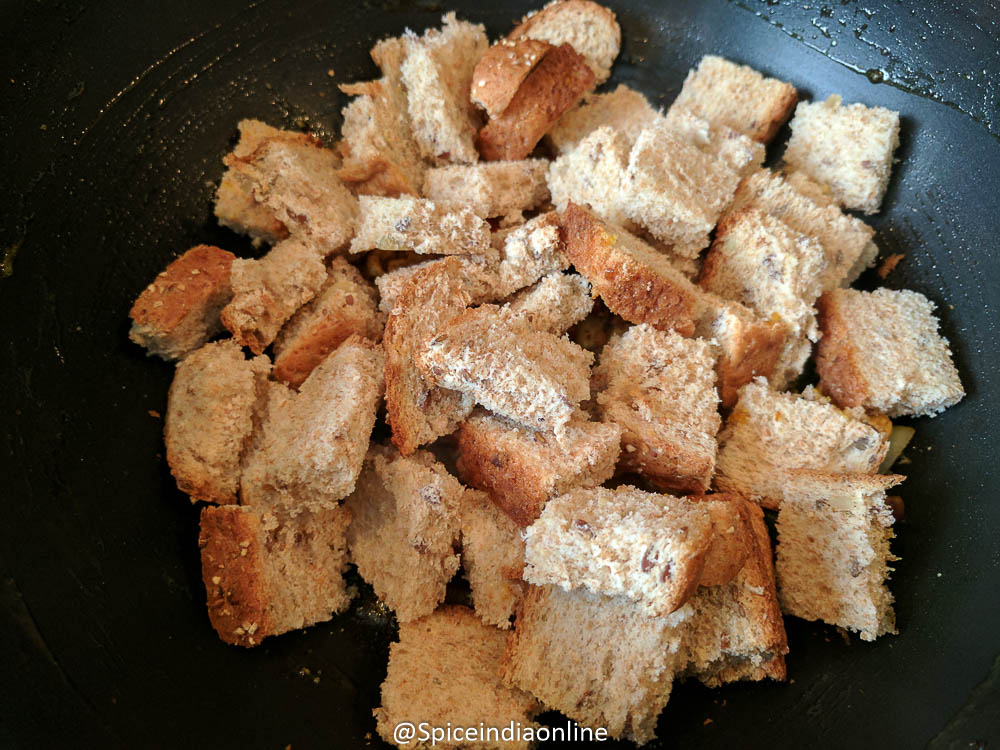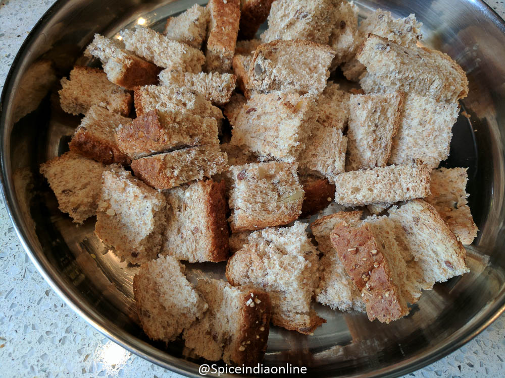 Meanwhile cut the bread slices into bite size pieces and keep them ready. I have wholegrain (multigrain bread) If you want to keep it healthy go with any wholegrain, multigrain… or just soft white bread.