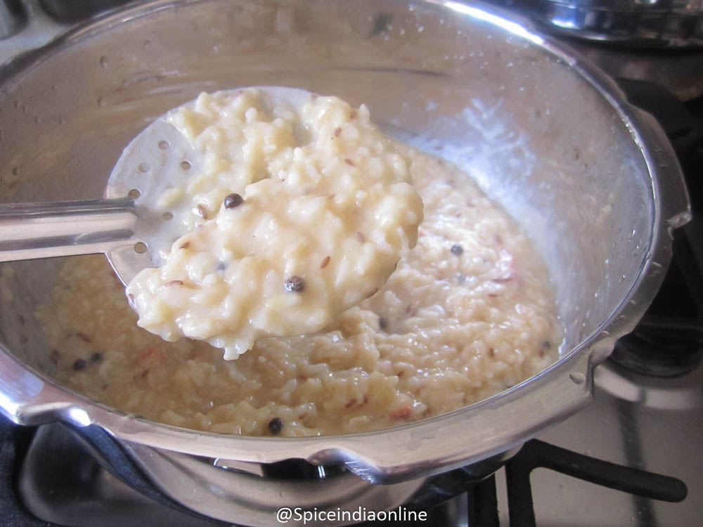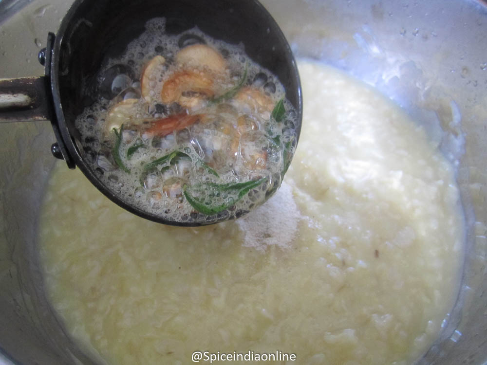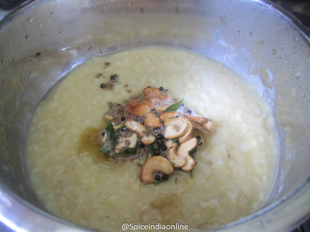 Heat half ghee & half oil, fry the cashews to golden, then add black pepper corns, cumin and curry leaves. Sprinkle asafoetida powder over it and immediately add it the cooked rice and dal mixture.