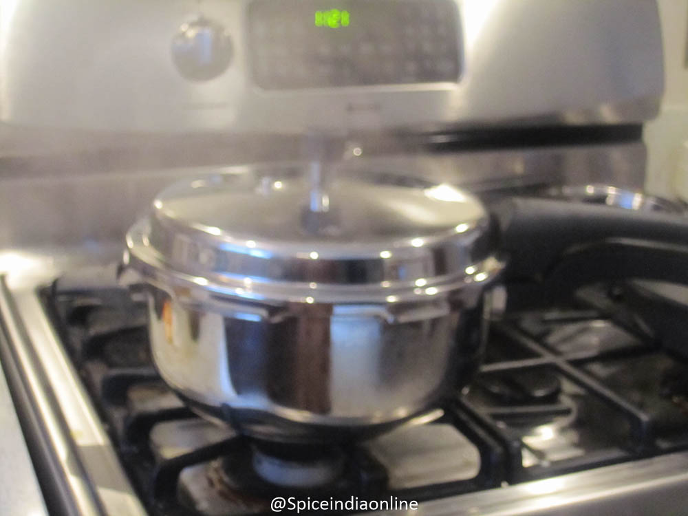 Add water – for this recipe of 1 cup brown basmati rice + 1/2 cup moong dal needs total of 4 cups of water. (Long grain rice cooks longer and needs more water – Short grain cooks faster and needs less water. If using regular short grain brown rice, then use only 3 & 1/2 cups of water)