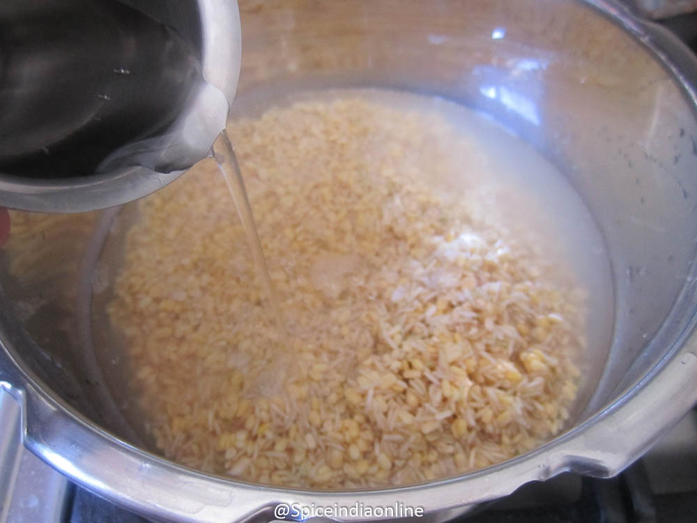 After soaking give it a few rinse and then drain all the water. Add the rice and dal to the pressure pan. (Moong when cooked in pressure cooker has the tendency to stick to the bottom of the pan, use the pressure cooker safe bowls to cook, if you have one ortherwise proceed as shown) Yes, a light layer do stick to the bottom but its ok!
