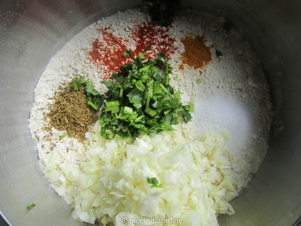 Take wheat flour in bowl, add in finely chopped cabbage, minced green chilli, ginger, chopped coriander leaves, ghee, turmeric powder, red chilli powder, cumin coriander powder and salt.