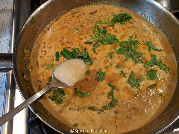 Add the coconut paste to the gravy and simmer until it thickens to the desired consistency.