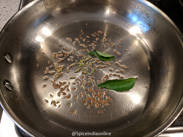 Heat oil in a pan… if you plan to cook the soaked channa then use a pressure cooker pan. Temper with cumin seeds, fennel seeds and curry leaves.