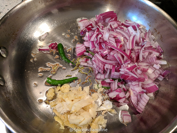 Add in onions, green chillies and crushed ginger garlic… saute well till the onions turn translucent.