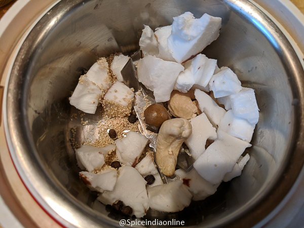 Meanwhile grind coconut, cashew, poppy seeds & black peppercorns with water to make a thin paste.
