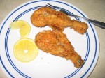 After 3 hours take the chicken from the water and wipe it with a paper napkin , Now take a beaten eggs and add salt and chopped cilantro and curryleaves and chilly powder or paprika and keep that aside then take allpurpose flour add little corn flour and bread crumbs(dont add too much of bread crumbs bcos it will ruin the colour of ur chicken) take the chicken and dip it with the beaten egg mixture(egg mixture =beaten egg/cilanto/curryleave/chilly powder /salt) and then immediately put it in the flour(all purpose,corn four , bread crumbs and salt) just coat the chicken with flour and fry the chicken using frier in 325degree for about 15 minutes if u dont have frier you can fry it in a pan or kadai/wok .