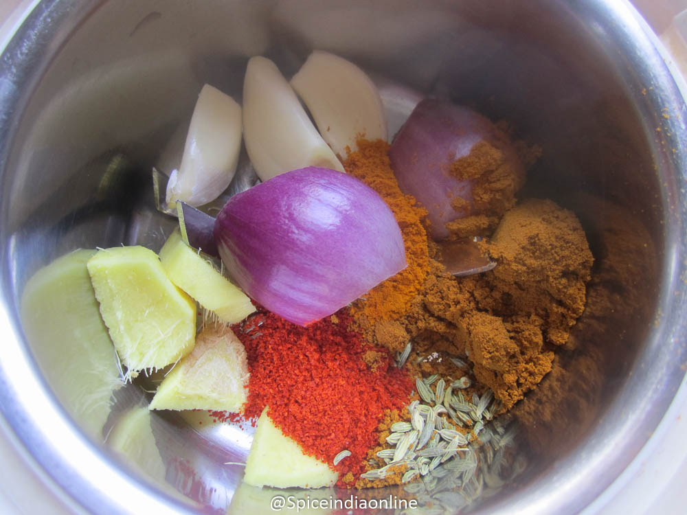 Combine onion, ginger, garlic, cumin seeds, fennel seeds, black pepper, turmeric powder, coriander powder, turmeric powder, salt and lemon juice in a mixer jar.