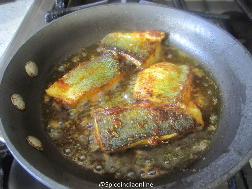 Heat oil in a fry and start frying over medium flame. Place skin side down first and fry for few minutes or until browns.