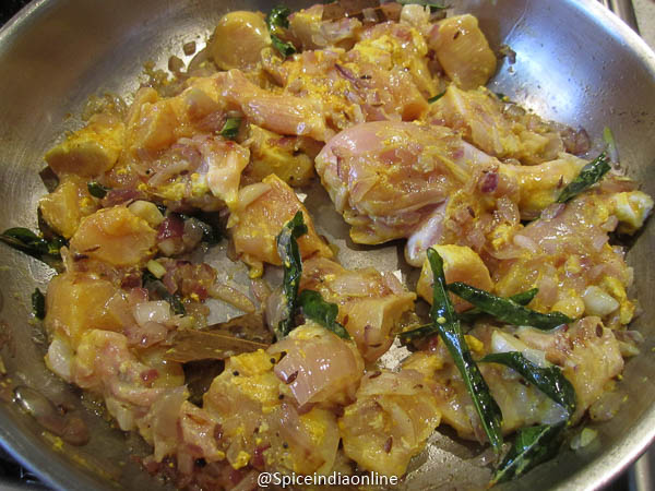 Add in the chicken along with turmeric powder and little salt and saute well with the onion mixture. Cook for about 2 minutes. Try our TAWA CHICKEN