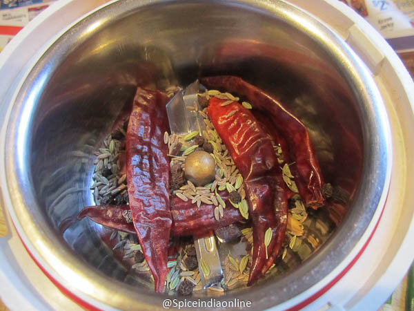 First lets take the dry ingredients from table- 1 dry red chilli, coriander seeds, cumin seeds, fennel seeds, black peppercorns in a mixer jar.