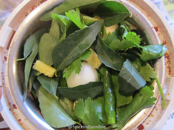 In the same mixer add in the wet ingredients from table-1 small onion, green chilli, ginger garlic, coriander leaves & curry leaves and grind along.