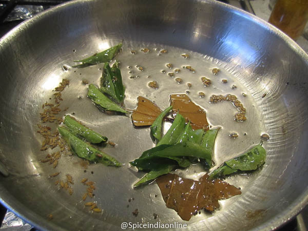 Now heat oil in a fry pan… season with mustard seeds, cumin seeds, bay leaf and curry leaves. let them sizzle a bit.