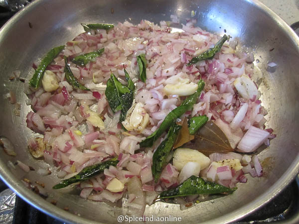 Now add in chopped onions along with crushed garlic and saute well. The onions have to be browned a bit… with crispy effect.