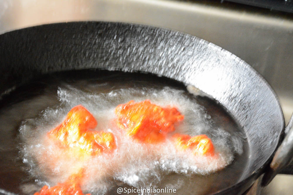 Heat oil in a kadai and start frying them in batches. Keep the flame at medium high when you start to fry and then reduce to medium low and fry until the outer coating turns firm and crispy.