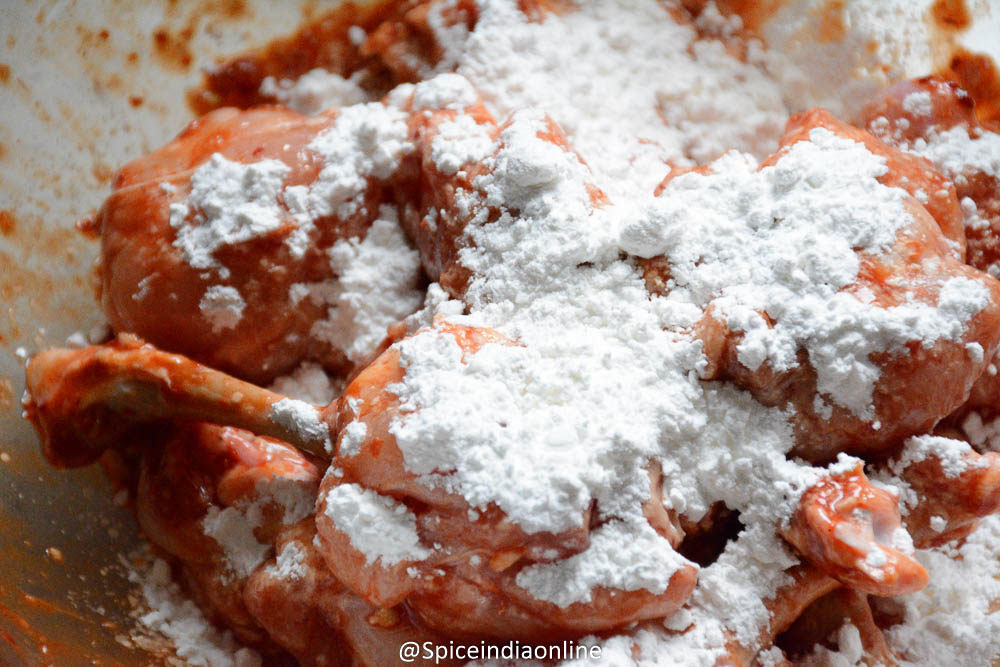 When you are ready to fry then add in the maida and corn flour to the chicken mixture.