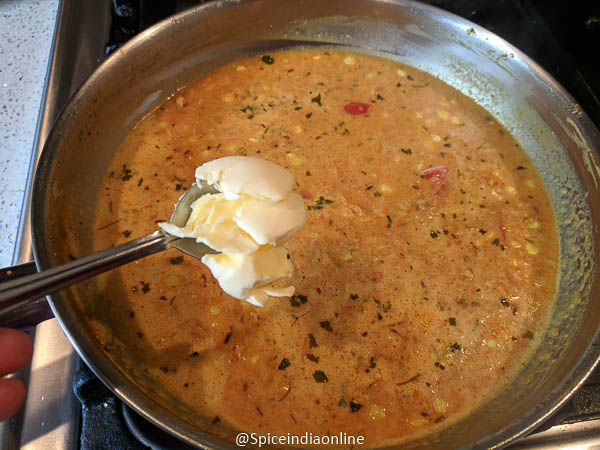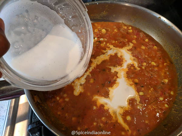 When the gravy is cooked with corn add in the milk cashew poppy seeds blend and simmer.